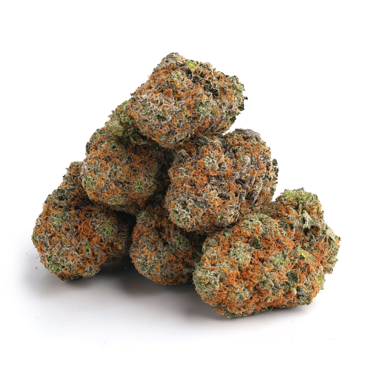 Chem Glue buds have a distinct, heavy look that mirrors their effects. The nugs are typically long, rounded, and dense, often taking on a plump, grape-like shape. They boast a deep forest green color, densely packed and threaded with a vibrant network of thin, fiery orange hairs. A fine, milky white dusting of tiny trichomes coats every surface, giving the buds a sticky, frosted appearance that hints at their formidable THC content.